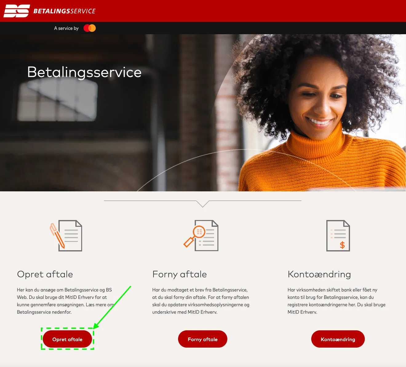 Du starter ved at gå ind på https://betalingsservice.mastercard.com/ og vælge 'opret aftale'. Herefter skal du logge ind med din medarbejdersignatur, hvorefter du vil blive sendt videre til et oprettelsesflow.