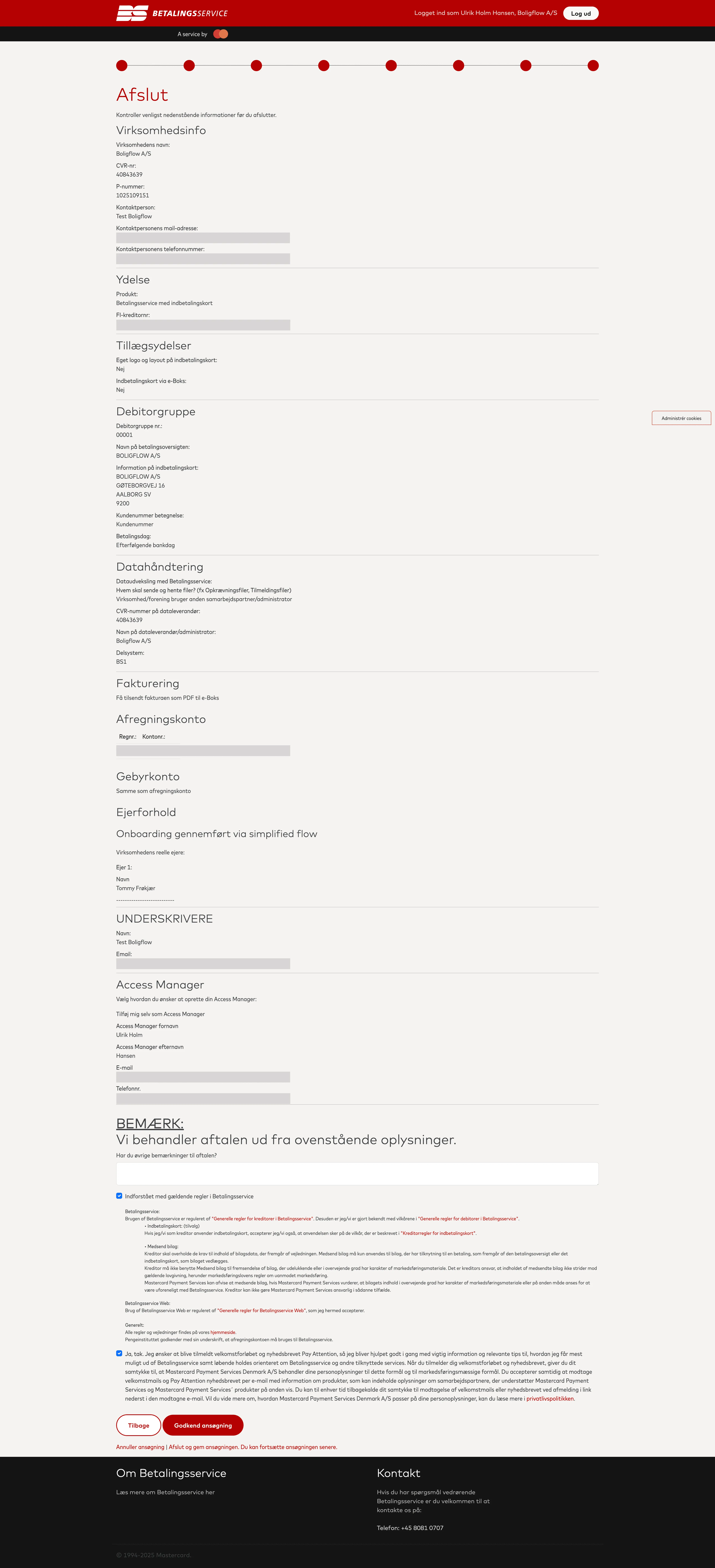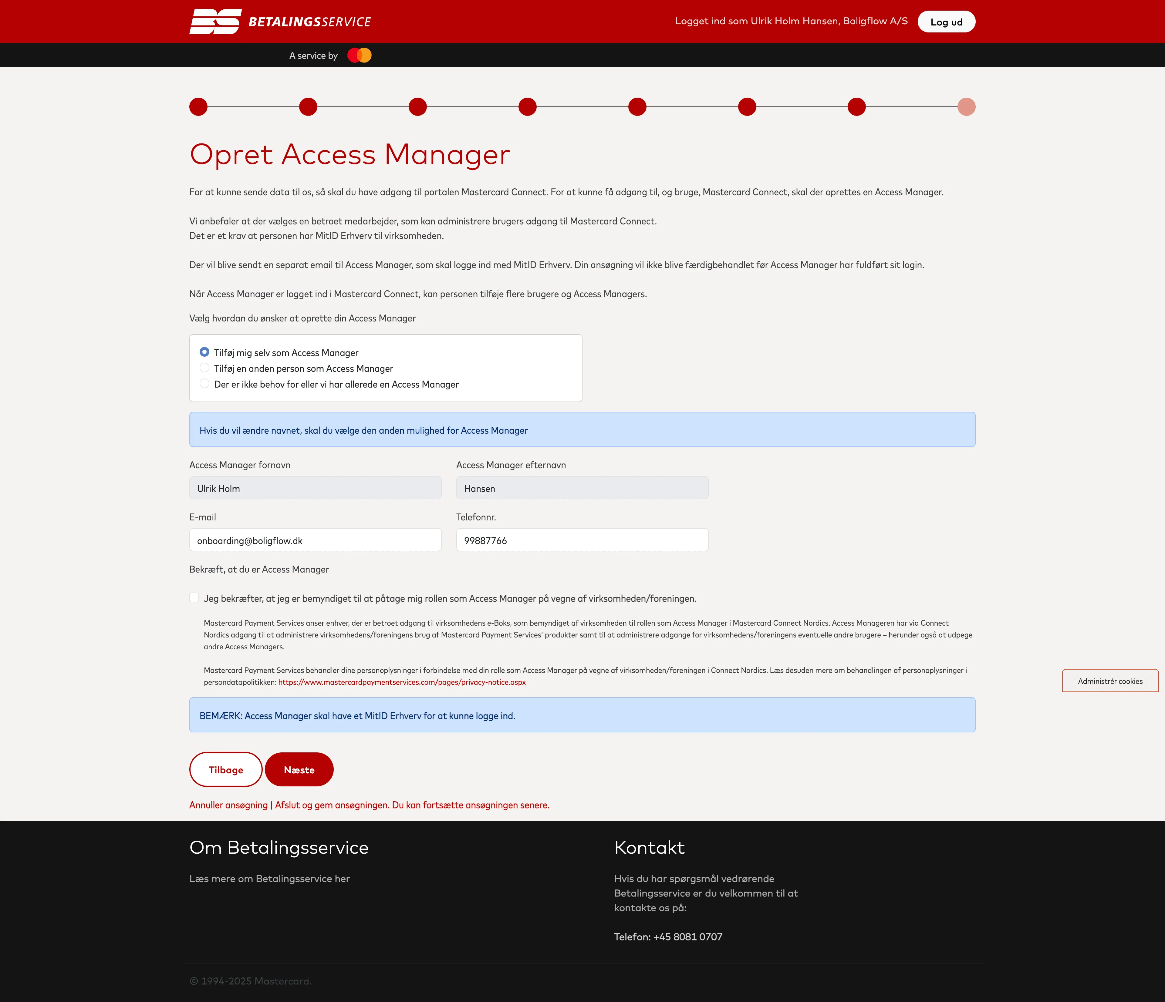 Nu skal du oprette en Access Manager som tilknyttes din Betalingsserviceaftale. Det er den person der oprettes som Access Manager der har mulighed for at logge ind på Betalingsservices portal og se oplysninger om aftalen samt lave ændringer.