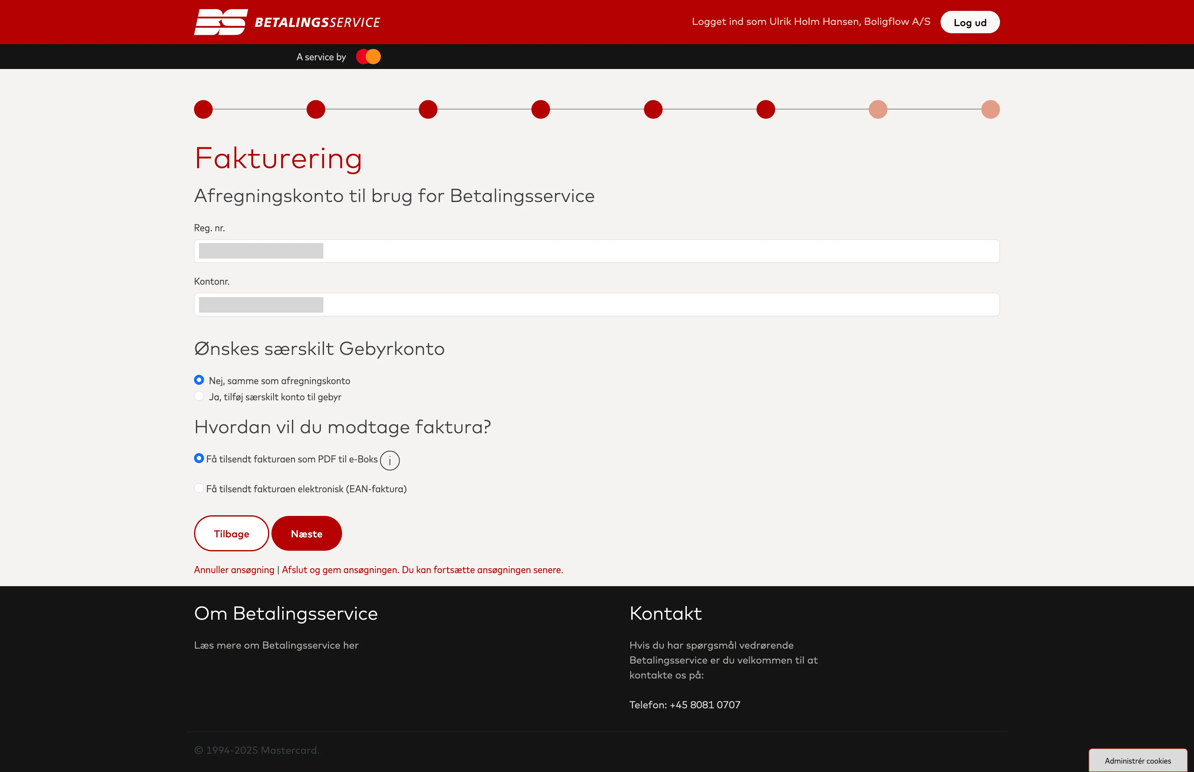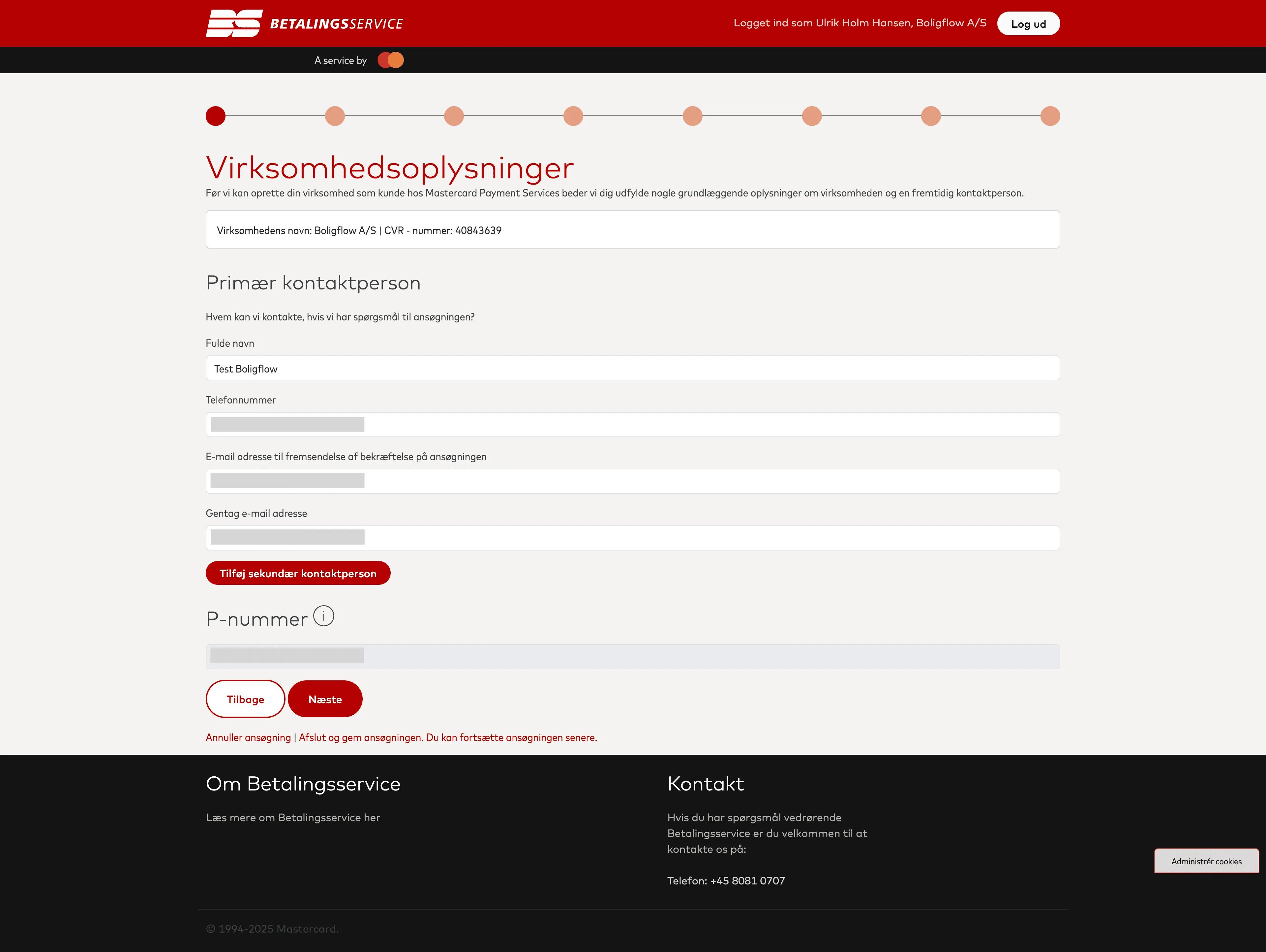 Her starter du med at indtaste navn og kontaktoplysninger på den primære kontaktperson i jeres virksomhed. Altså den, som vil beskæftige sig mest med jeres Betalingsserviceaftale.
