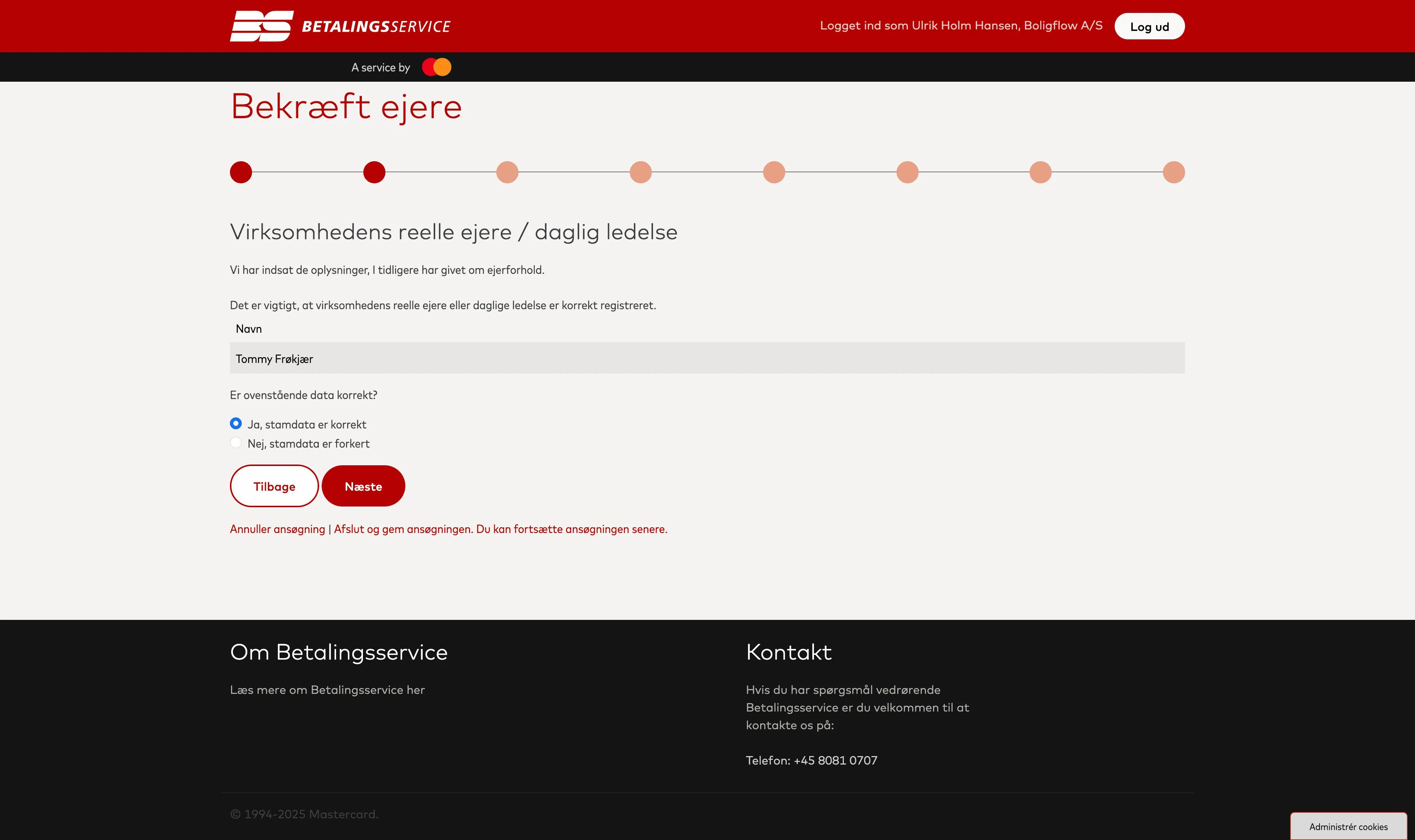 Nu skal du bekræfte Virksomhedens reelle ejere / daglig ledelse. Hvis alt er ok, kan du blot vælge Ja, stamdata er korrekt.