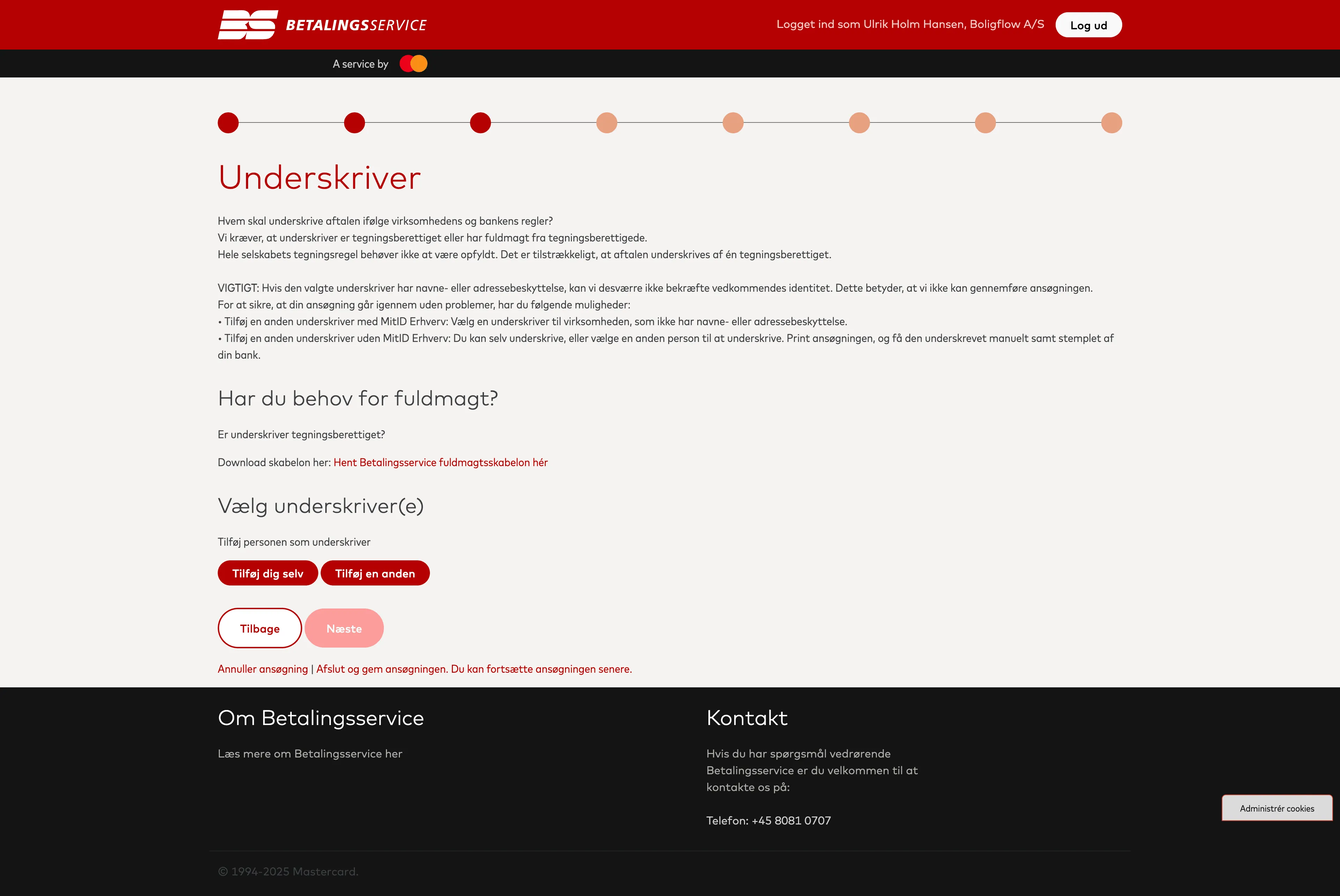 Tilføj den person som skal underskrive for at oprette Betalingsserviceaftalen. Det er vigtigt at underskriveren enten selv er tegningsberettiget, eller har fået en fuldmagt fra en tegningsberettiget.